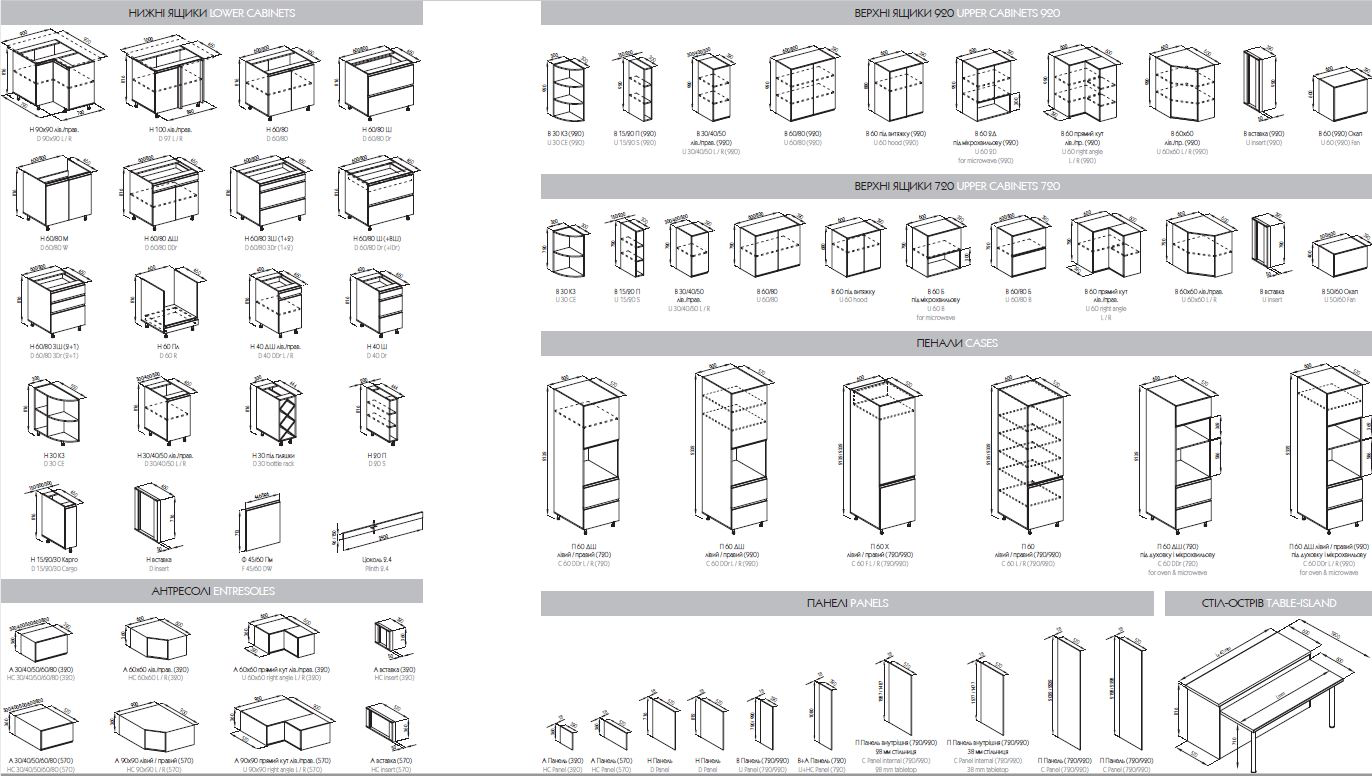 Фасади ДСП: Білий / Ательє світлий / Зелений димчастий / Сахара / Сатин / Глиняний сірий / Дуб королівський / Дуб сільверджек вінтажний / Іриска / Сіра мишка / Сутінковий блакитний.